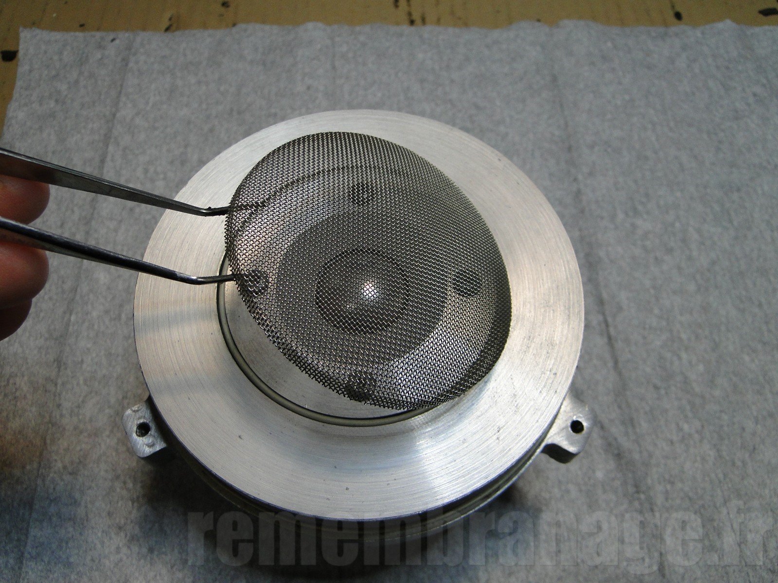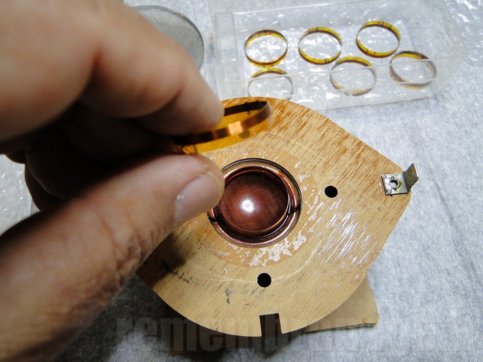 Démontage du tweeter : Enlever la grille qui est juste emboitée, et récupérer le joint périphérique blanc.